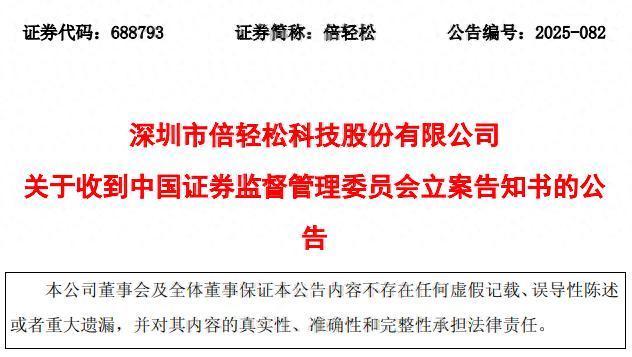 12月25日晚间,倍轻松(688793.SH)公告称,公司当日收到中国证监会下发的《立案告知书》,因公司及实际控制人马学军涉嫌信息披露违法违规,中国证监会决定对公司及马学军立案。
