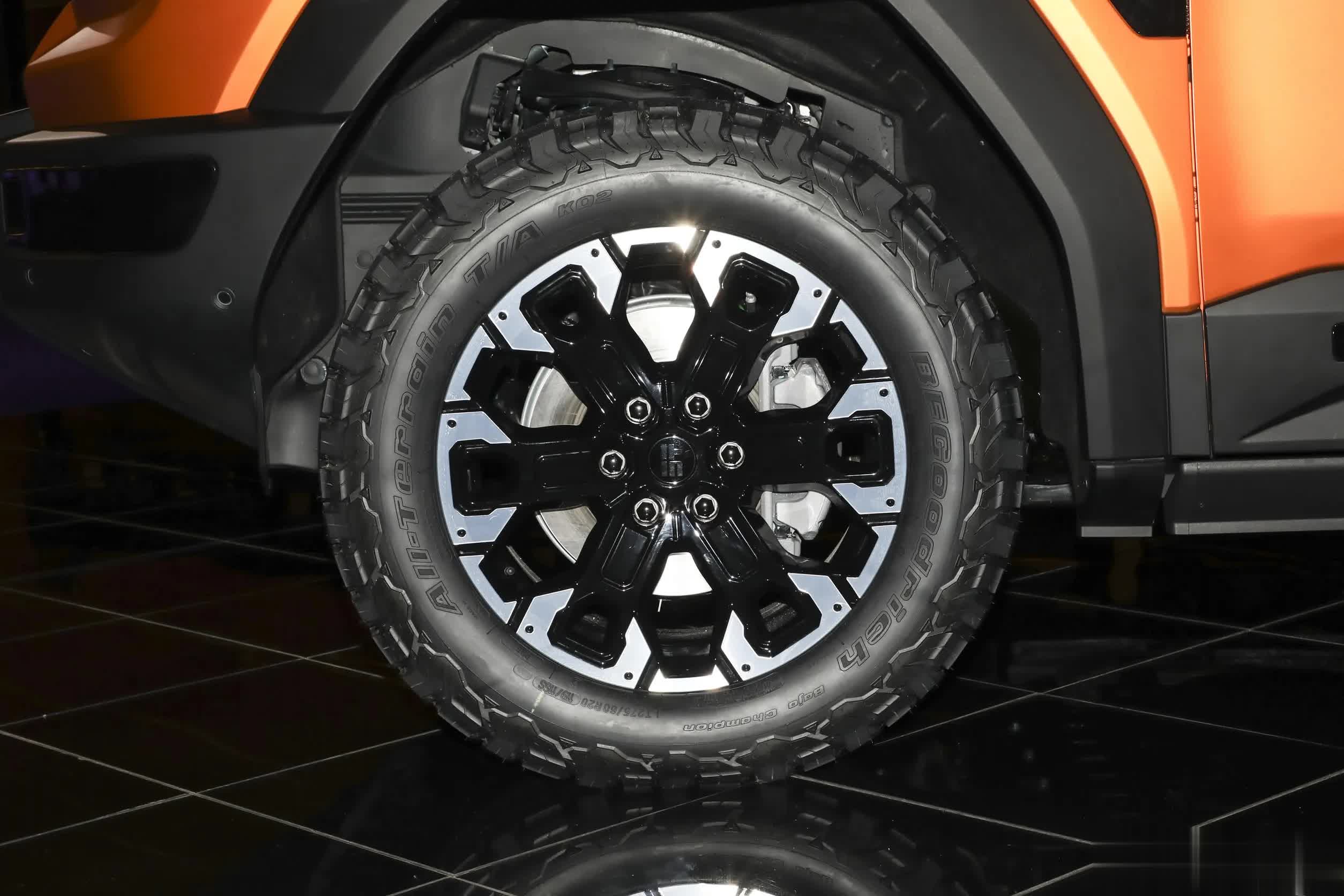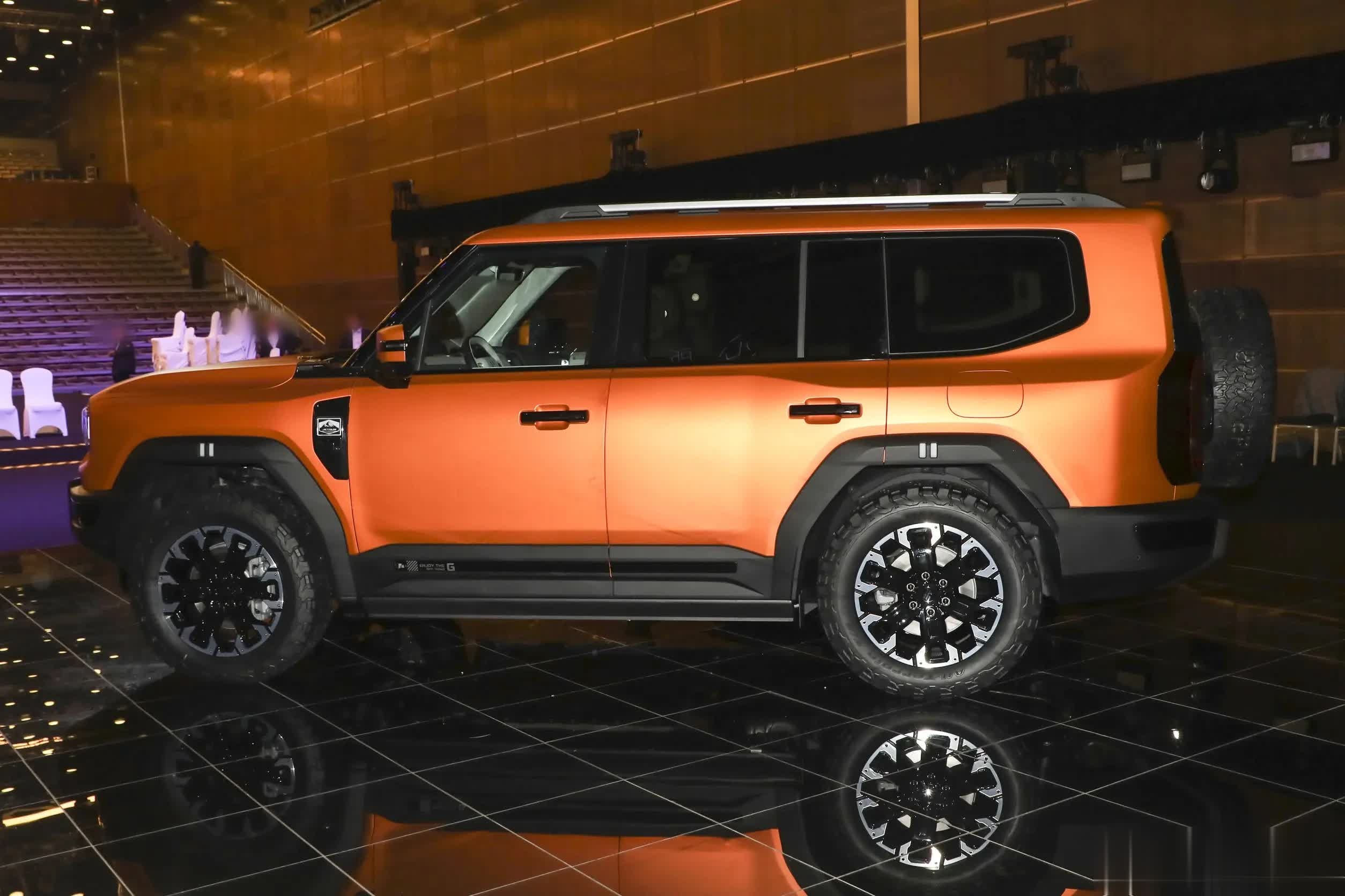 车身侧面采用方盒子造型,乍看之下很难不让人联想到新款普拉多,车身轮廓和线条运用得刚刚好。车窗范围足够大,采光效果不错,轮眉与车门周围的黑色饰件,透露出一股极强的力量感。外凸的轮眉还嵌入了示宽灯设计,夜间行驶时无疑多了一层保障。行李架与隐私玻璃的配置,也顺势强化了整车的独特性,兼顾硬核越野的同时也保持了较高的舒适度。因此,整个车侧既有张扬的气息也没丢掉优雅的姿态。
