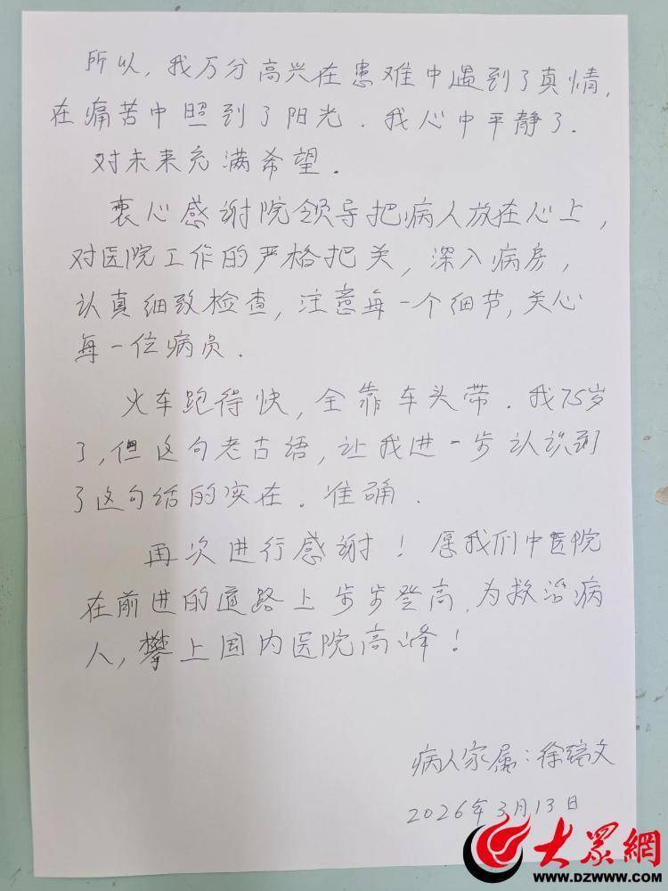 “肿瘤科收治的病人是特殊群体,我们不仅要治病,更要医心。这封感谢信是对过去工作的认可,更是对未来工作的鞭策。它就像一缕冬日暖阳,温暖了每一位医护人员的心。内一病区全体人员将以此为动力,继续用精湛的医术和有温度的护理,为更多患者点亮生命的希望之灯!”曲阜市中医院护士长孙思琪说。